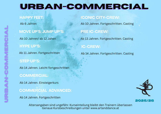 Commercial ist ein Einsteigerkurs. Commercial Advanced ist fortgeschritten. Es wird Commercial und Videoclip unterrichtet. Die Schülerinnen sollen hier wie in Musikvideos oder als Background Tänzerinnen tanzen lernen und ihre Moves verbessern. Verschiedene Tanzstile werden in die Choreographien einfließen und es wird an der Präzision und der Power in den Bewegungen gearbeitet. Dieser Kurs ist für die burgenländischen Landesmeisterschaften eingeplant.